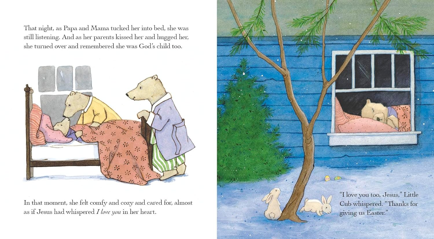 小熊小熊與爸爸,媽媽和她的兄弟姐妹一起慶祝復活節,她開始向爸爸詢問一年中這個非常特殊的日子。爸爸親切地解釋了上帝為他的孩子們的計劃,同時在她令人難忘的北極世界中散步小幼崽,他分享了復活節的清晰,簡單的術語,即使是最小的幼崽也可以理解。