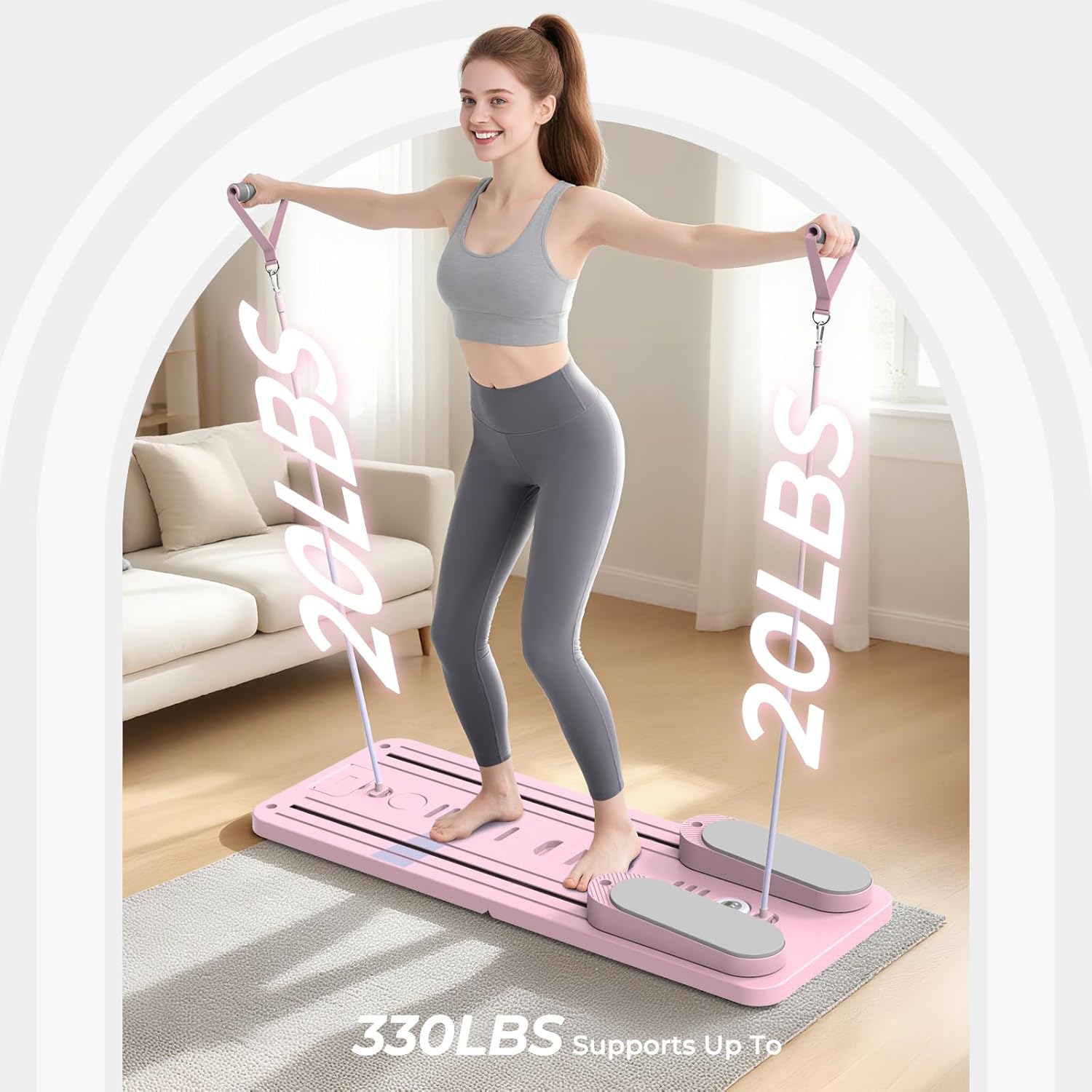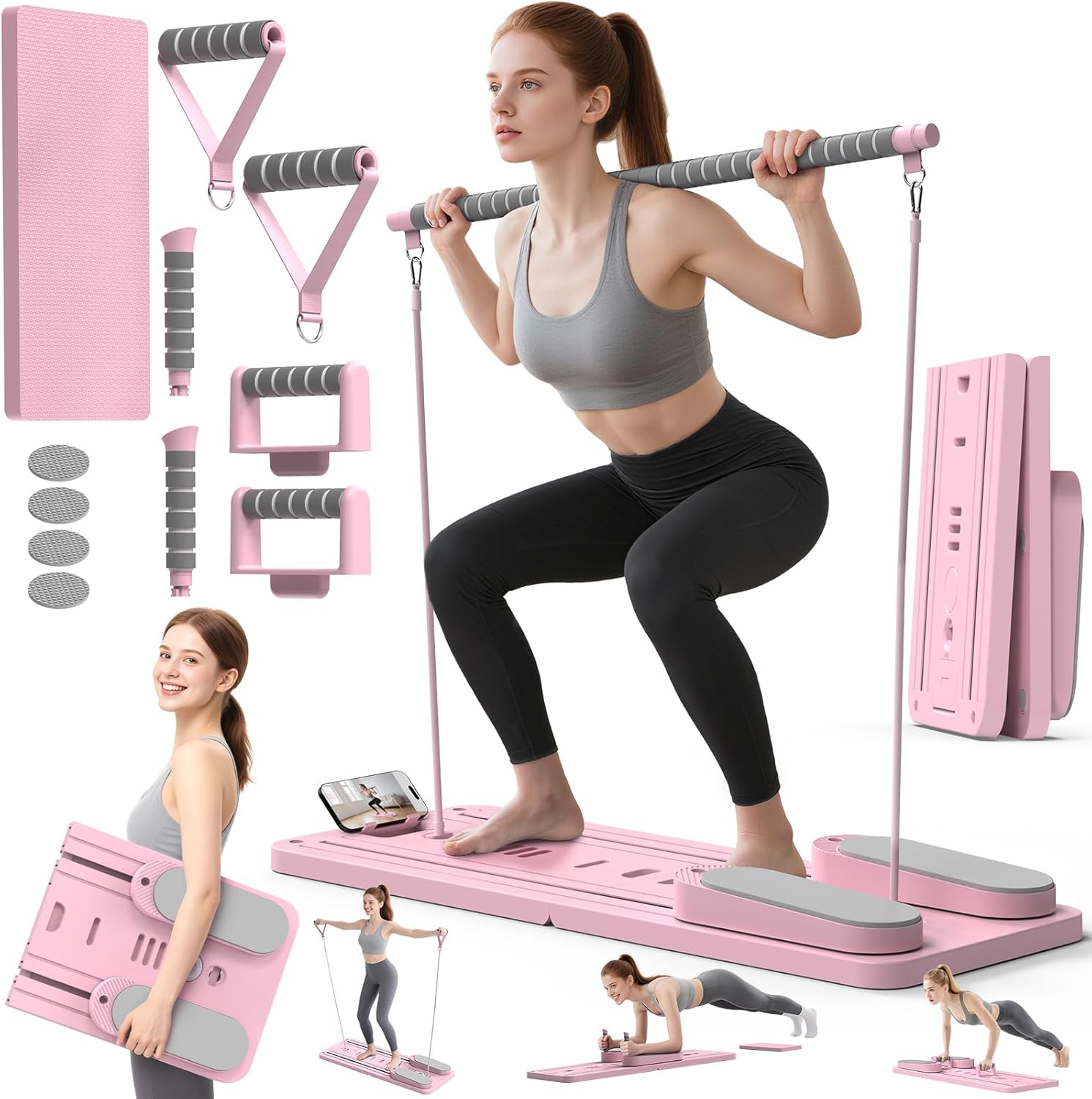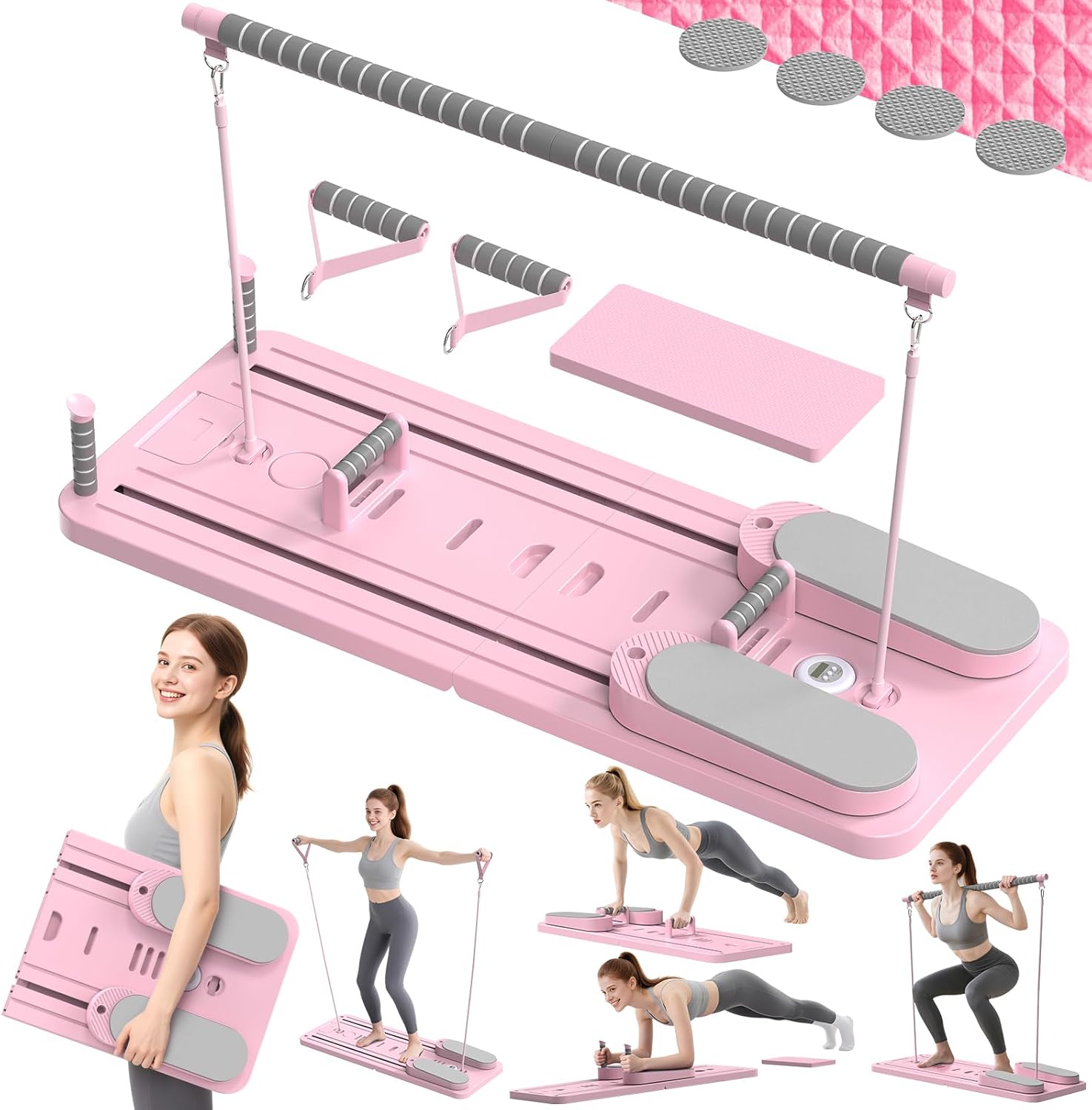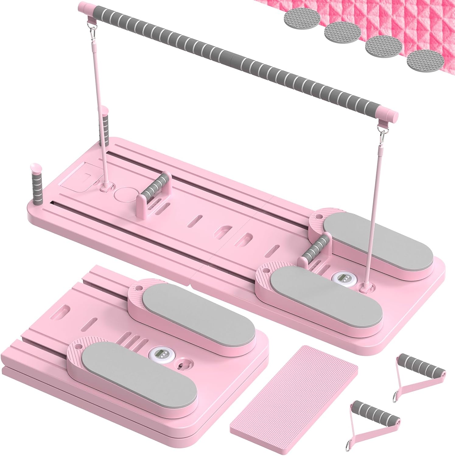 多功能普拉提板、普拉提塑身機套裝、7 合 1 可折疊普拉提塑身機,適合家庭鍛煉,帶計時器、手機支架、俯臥撐桿、腹部板、容量為 330 磅的便攜式套裝
