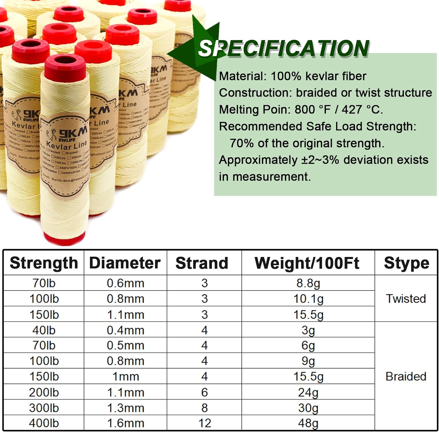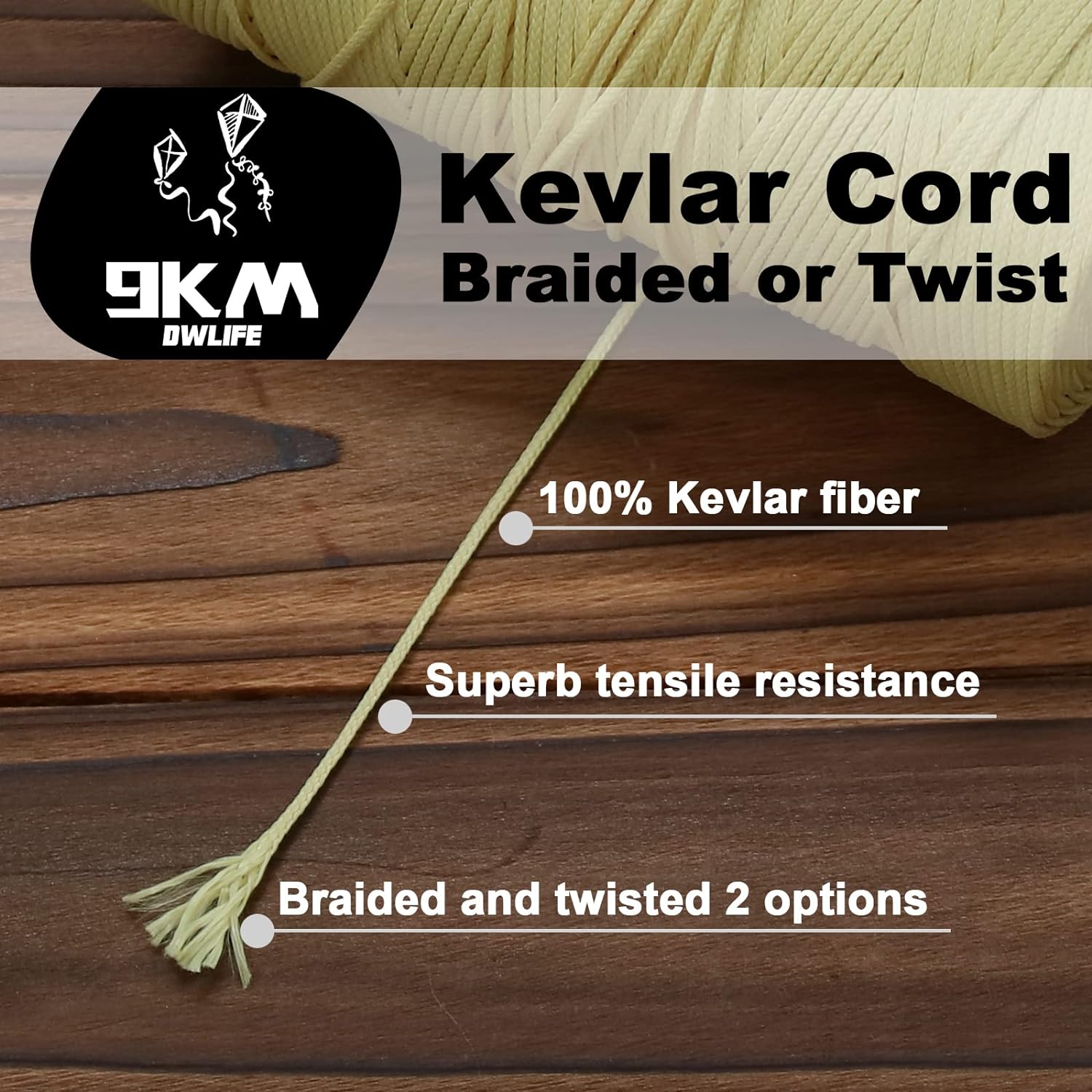 9 公里 DWLIFE 凱夫拉風箏線 100 磅 1000 英尺編織凱夫拉線低彈力高強度重型釣魚輔助線露營遠足戶外求生繩