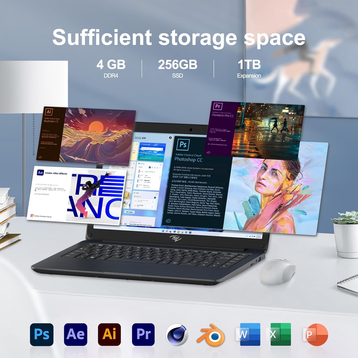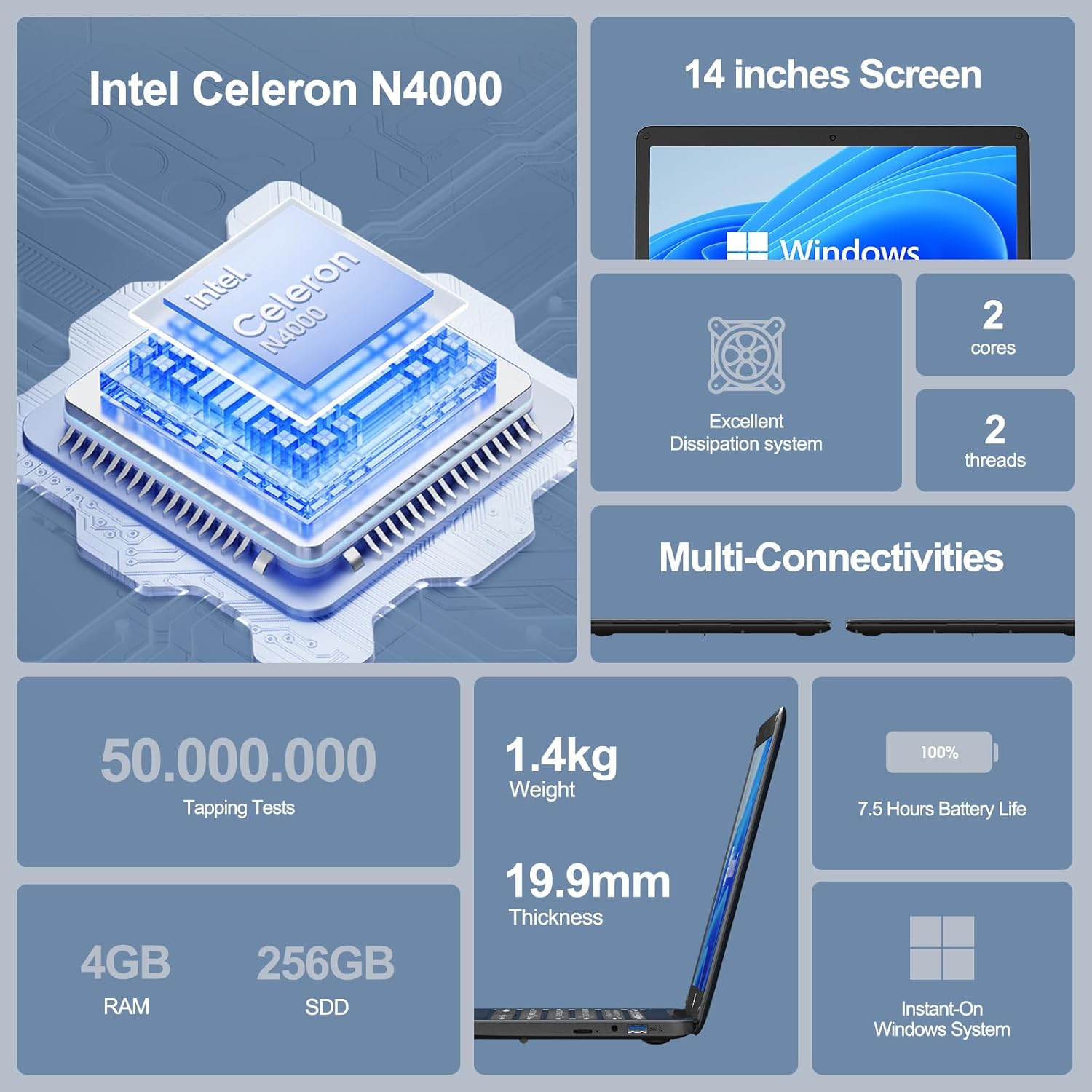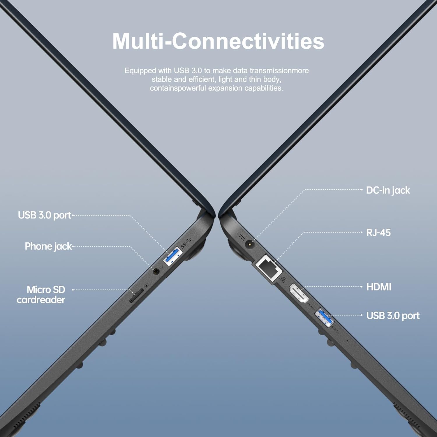 💾【可擴展存儲】LETSUNG 筆記本電腦配備 4GB LPDDR4X RAM (2400MHz) 和 256GB M.2 SATA SSD – 可升級至 1TB 以獲得額外容量。它還包括一個 1 個 2.5 英寸 SATA HDD (7mm) 插槽,可擴展至 1TB,以及一個與 SD/SDHC/SDXC 卡兼容的內置 microSD 讀卡器,為您提供靈活的文檔、媒體等存儲選項。