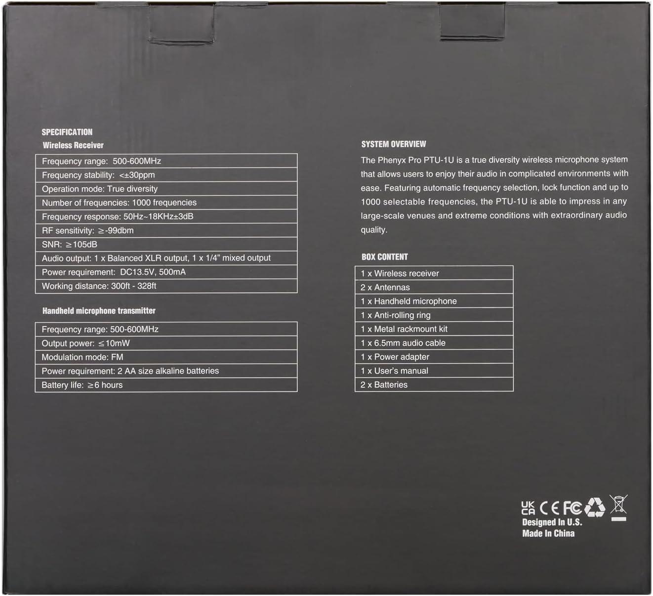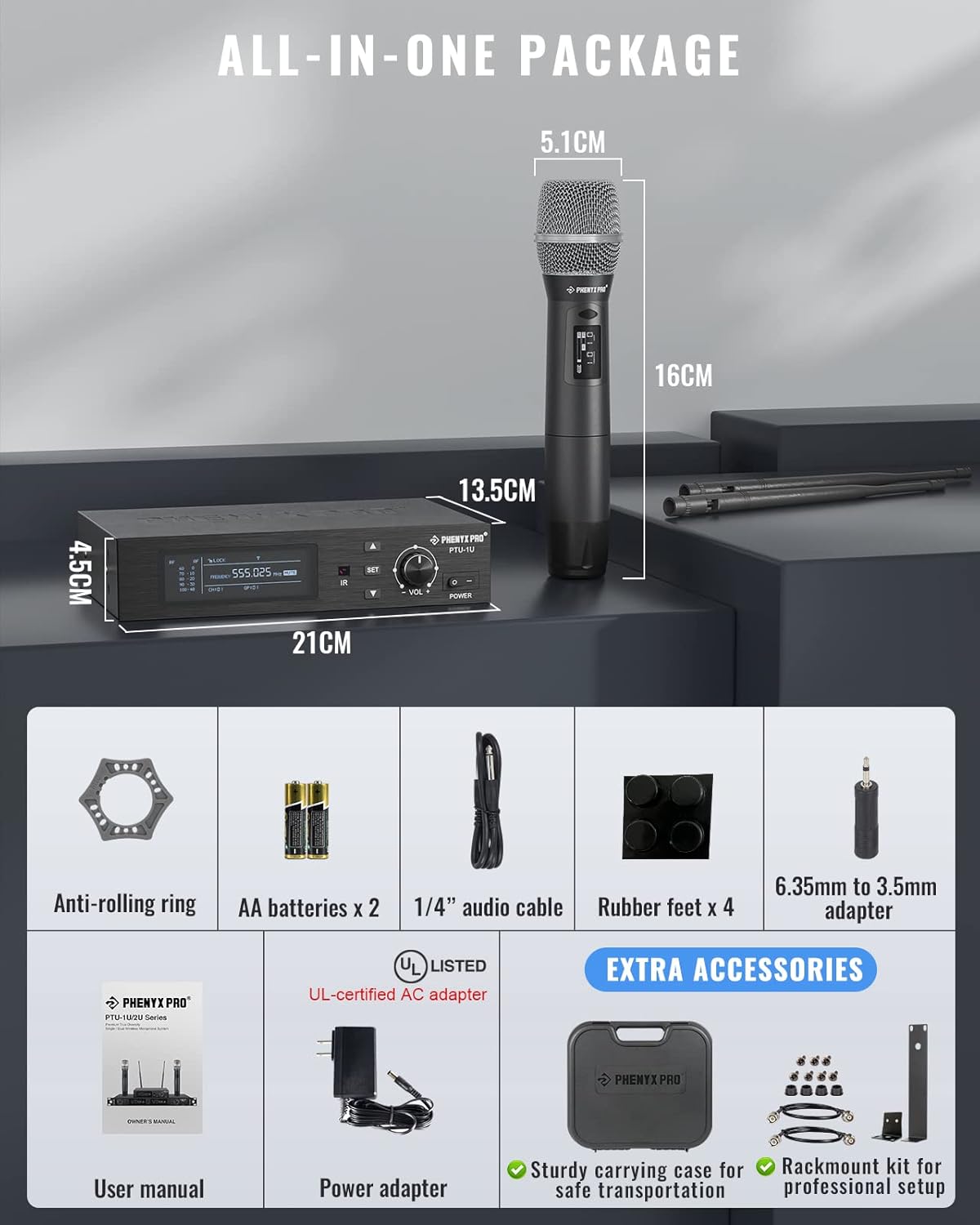 包裝內容:1 x 單通道無線金屬接收器、1 x UHF 手持麥克風、1 x 1/4'' 音訊線、1 x 電源轉接器、1 x 防滾環、2 x 天線、2 x AA 電池(16小時)長時間使用、1 本使用手冊、1 x 天線套件