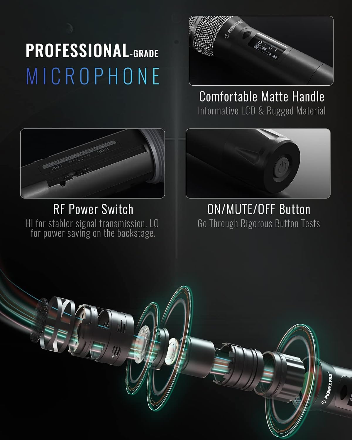 專業級無線效能:單聲道 UHF 頻段 (555 – 580MHz) 音訊無線麥克風系統具有先進的真正分集電路,可提高抗干擾能力。 手持式麥克風可提供極為穩定的訊號和原始聲音再現。 1000 個可選頻率允許多組操作並避免複雜設定中的干擾。 具有快速紅外線同步功能的 300 – 328 英尺視線遠距離操作