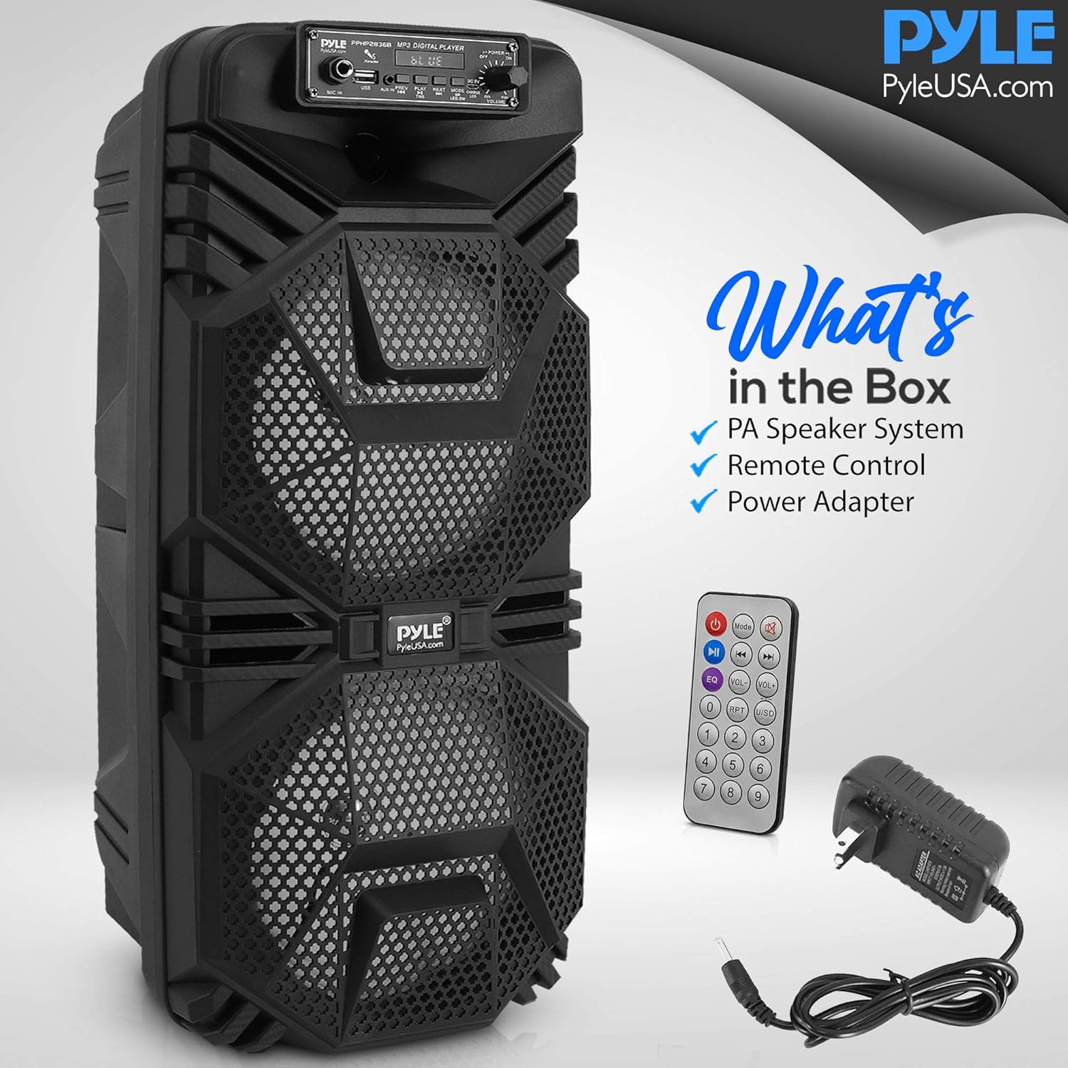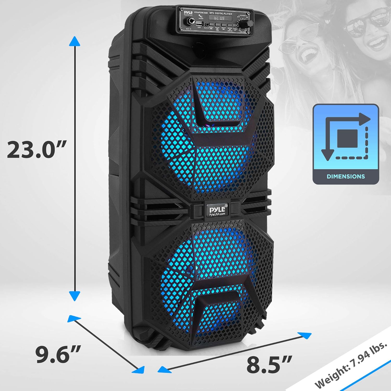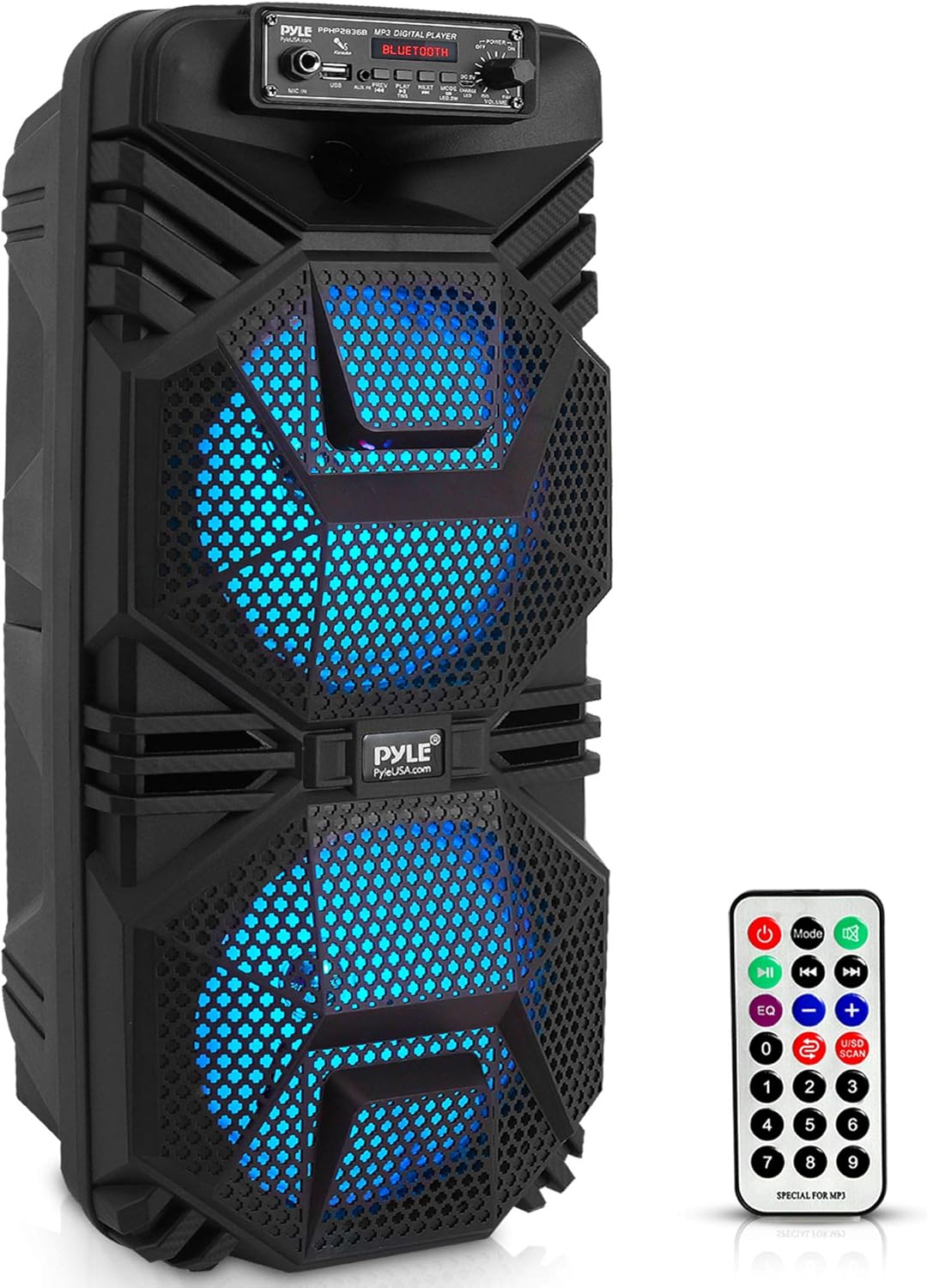 Pyle 便攜式藍牙 PA 揚聲器系統,600W 可充電戶外藍牙揚聲器便攜式 PA 系統,帶雙 8 英寸低音炮 1 英寸高音揚聲器、麥克風輸入、派對燈、USB、收音機、遙控器