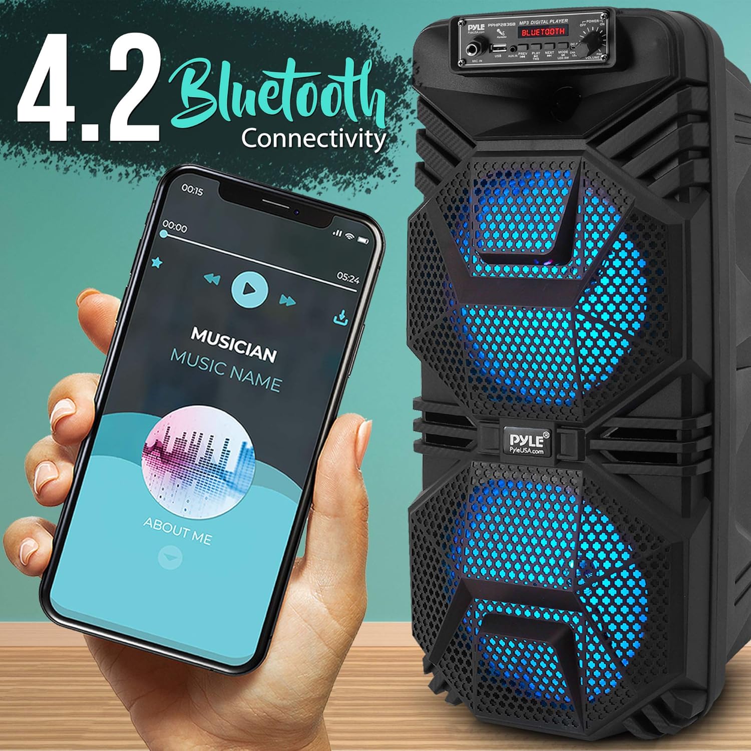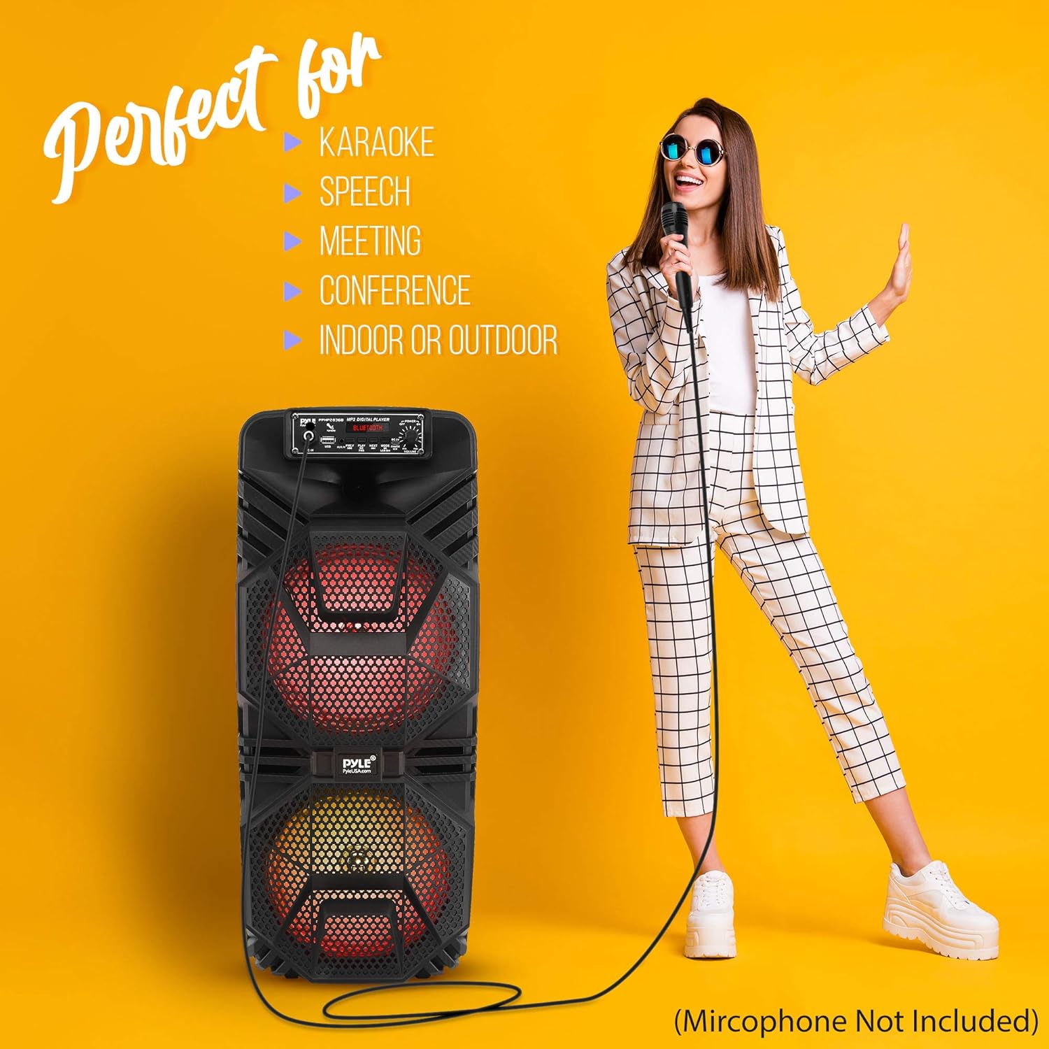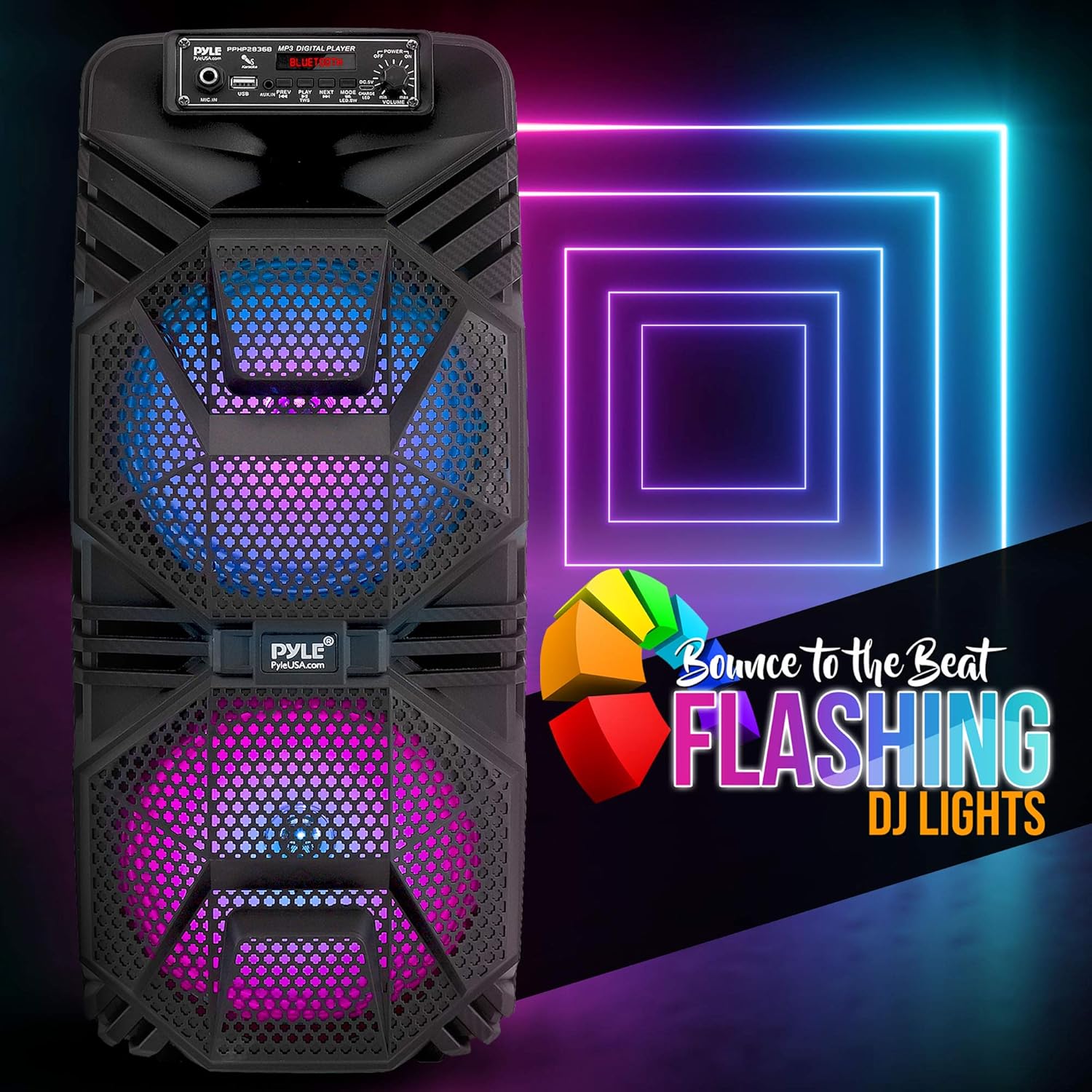 Pyle 便攜式藍牙 PA 揚聲器系統,600W 可充電戶外藍牙揚聲器便攜式 PA 系統,帶雙 8 英寸低音炮 1 英寸高音揚聲器、麥克風輸入、派對燈、USB、收音機、遙控器
